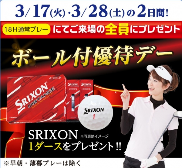春のゴルフシーズン到来!3月28日(土)にご来場いただいた皆様全員に、箱ごとドーンと「SRIXONボール1ダース」をプレゼントいたします。新品のボールで、気持ちよくナイスショットを連発しませんか?土曜日限定の特別開催につき、予約枠は残りわずか。お仲間を誘って、お早めにお申し込みください!
